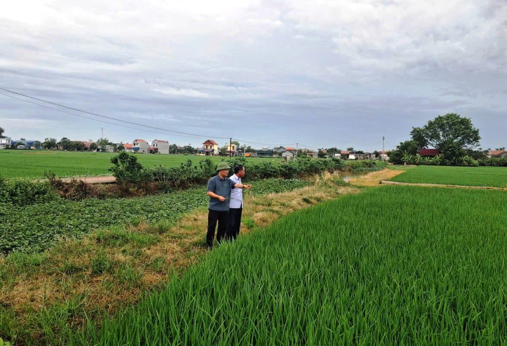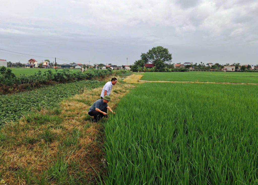 Đồng chí Lê Minh Tuấn, Phó Bí thư Đảng ủy, Chủ tịch UBND xã(áo đen) kiểm tra lúa mùa tại cánh đồng Hiệu Vũ, xã Ngự Thiên