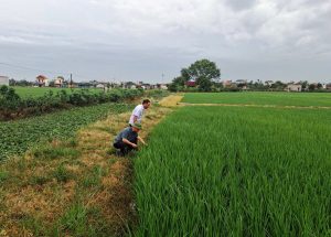 Đồng chí Lê Minh Tuấn, Phó Bí thư Đảng uỷ, Chủ tịch UBND xã kiểm tra, chỉ đạo công tác phòng trừ sâu bệnh trên lúa mùa